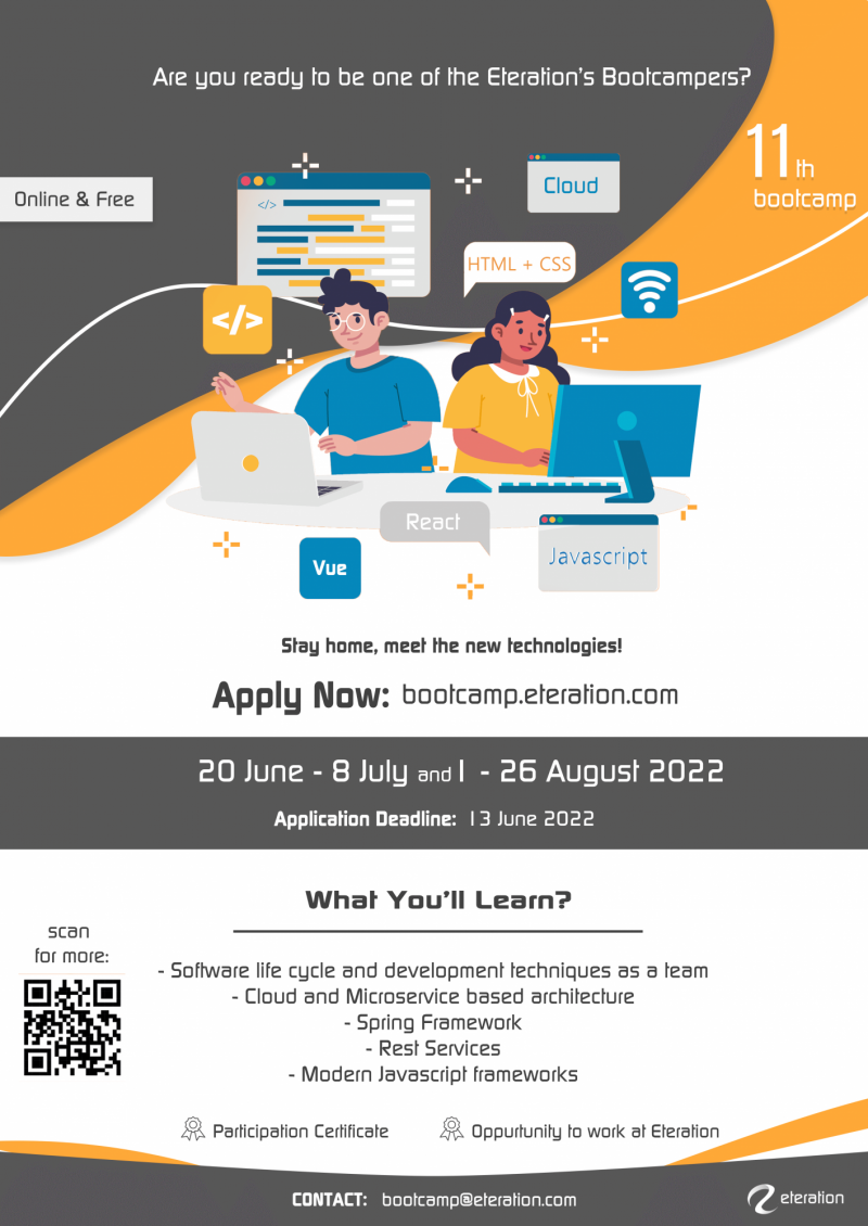 Genç yazılımcıların kendilerini geliştirmelerine, staj yapabilmelerine ve sonrasında da iş hayatına atılabilmelerine fırsat tanıyabilmek için bu sene 11.si gerçekleşecek olan Bootcamp etkinliği uzaktan (online) düzenleniyor. Bu yıl mezun olacak ya da son sınıfa geçecek öğrenciler ile başarılı olan öğrenciler imkanlarından yararlanabilir.