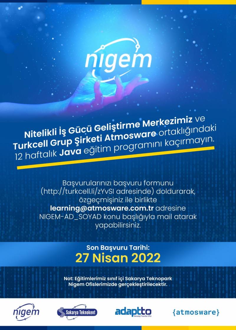 Sakarya Üniversitesi Teknokent bünyesinde kurulan Nitelikli İş Gücü Geliştirme Merkezi ve Turkcell Grup Şirketi Atmosware işbirliğiyle yürütülecek olan 12 haftalık Java eğitim programını kaçırmayın.