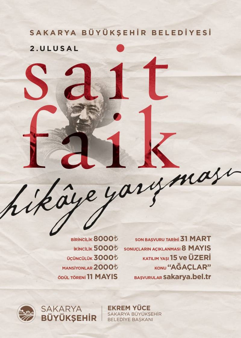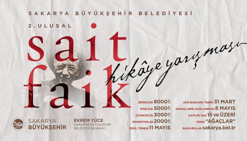 Adapazarı'nda 1906 yılında dünyaya gelen, öykücülüğü ile Türk edebiyatında önemli bir yer edinmiş olan Sait Faik ABASIYANIK'ın anısını yaşatmak, genç kuşaklara tanıtmak ve hikâye alanında yapılan çalışmaları desteklemek amacıyla Müdürlüğümüz ile Sakarya Büyükşehir Belediyesi işbirliğinde "2. Ulusal Sait Faik Hikâye Yarışması" düzenlenmektedir. Konusu "Ağaçlar" olan yarışmanın son başvuru tarihi 31 Mart 2023 Cuma günü olan yarışmanın detaylı bilgilerine www.sakarya.bel.tr adresinden ulaşılabilmektedir.