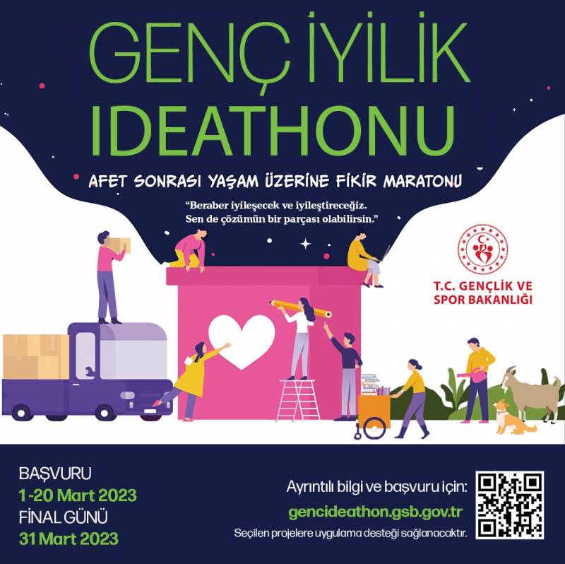 6 Şubat 2023 tarihinde Kahramanmaraş'ın Pazarcık ve Elbistan ilçelerinde meydana gelen ve 11 ilimizde etkili olan deprem afeti sonrasında ortaya çıkan ihtiyaç ve iyileştirme alanlarına yönelik çözümler konusunda gençlerin gözlemledikleri sorunları, kendi bakış açıları ile ifade etmeleri ve sorunlara yönelik çözüm önerilerini sunmaları amacıyla "Genç İyilik Ideathonu" konulu fikir yarışması düzenlenmektedir. Söz konusu fikir yarışması başvuruları 01-20 Mart tarihleri arasında https://gencideathon.gsb.gov.tr/ adresinden alınmaktadır. Genç Ideathon'a 18-25 yaş aralığındaki gençler; iki-beş kişilik takımlar halinde başvuru yapabilecek olup seçilen fikirler uygulamaya koyulacaktır. Yarışmaya ilişkin detaylar başvuru linkinde yer almaktadır.