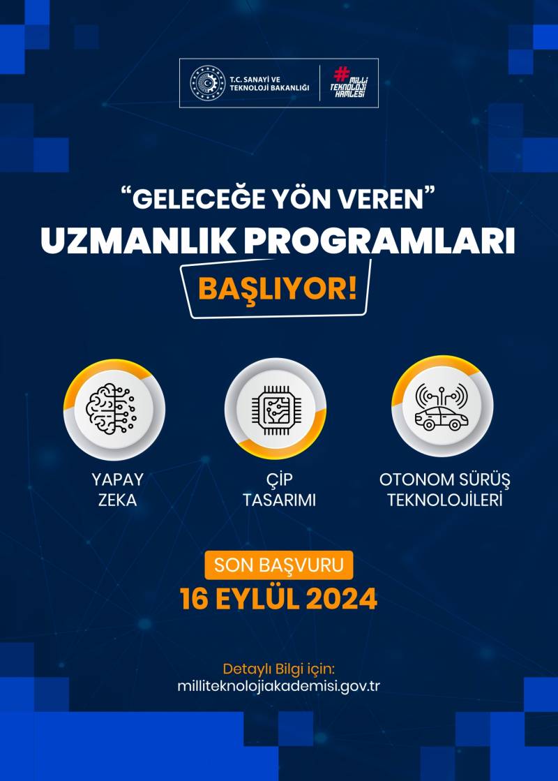 SANAYİ VE TEKNOLOJİ BAKANLIĞI tarafından Ülkemizin Milli Teknoloji Hamlesi çalışmaları doğrultusunda ihtiyaç duyulan nitelikli insan kaynağını yetiştirmek amacıyla Yapay Zeka, Otonom Sürüş Teknolojileri ve Çip Tasarımı alanlarında eğitim programları hayata geçirilmiştir. 2023-2024 eğitim döneminde Yapay Zeka Uzmanlık Programına 5.401 başvuru alınmış ve temel eğitime kabul edilen 720 öğrenci arasından ders katılımı ve sınav başarısı doğrultusunda 120 senkron, 380 asenkron olmak üzere toplam 500 öğrenci uzmanlık eğitimi almıştır. 2024-2025 eğitim döneminde ise Yapay Zeka Uzmanlık Programı ile birlikte Otonom Sürüş Teknolojileri ve Çip Tasarımı Uzmanlık Programları olmak üzere 3 odak alanda geliştirilmiş eğitim programları uygulanacaktır. Yapay Zeka odak alanında Arçelik, Baykar, Cezeri, Havelsan, Huawei, Tübitak paydaşlığı ile Veri İşleme ve Entegrasyon Uzmanlığı Eğitimi, Otonom Sürüş Teknolojileri odak alanında Aselsan, AVL, Baykar, Fev Türkiye, Ford, Togg, Tübitak paydaşlığı ile Otonom Sistem Geliştirme Uzmanlığı Eğitimi, Çip Tasarımı odak alanında Ankasys, Electra IC, Elevation, Tütel,Yongatek paydaşlığı ile Sayısal Tasarım ve Doğrulama Uzmanlığı Eğitimi verilecektir. Eğitim programları, üniversitelerin ilgili bölümlerinin (bknz: mth.tc/YtoX) 3. ve 4. sınıf öğrencilerine yönelik olarak, 5 hafta temel eğitim ve 25 ila 30 hafta sürecek uzmanlık eğitimi şeklinde planlanmıştır. Ders müfredatı, belirtilen program başlıkları çerçevesinde, paydaş firmalar tarafından öğrencilere sunulacaktır. Program boyunca öğrenciler eğitim kapsamında ara proje ve bitirme projesi hazırlayacaktır. Aynı zamanda tüm süreçte öğrencilerimize program paydaşlarımız tarafından mentorluk desteği verilecektir. Programı başarıyla tamamlayan öğrencilere eğitim aldıkları firmalar tarafından staj imkanı sağlanacaktır. Başvuru kabul kriterleri ve duyuru görseli Ek’te yer almaktadır. Başvurular 26 Ağustos 2024’te başlamış olup 16 Eylül 2024 tarihinde sona erecektir.